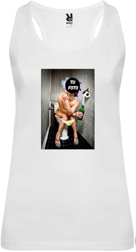 Camiseta de tirantes blanca para despedida de soltera con imagen de chica en baño de fiesta, sobre la que podrá incluir también su frase