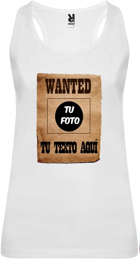 Camiseta de tirantes blanca para despedida con diseño Wanted para poner tu foto