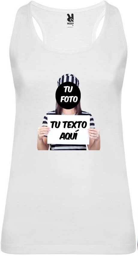 Camiseta de tirantes en color blanco para despedida con diseño de fugitiva sobre el que podrá incluir su cara