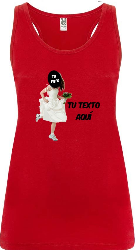Esta camiseta de tirantes está prediseñada para celebrar despedidas de soltera y fiestas. Solo tiene que indicarnos qué foto poner en el rostro de la chica, así como un texto que acompañe el diseño.