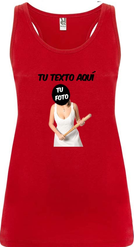 Camiseta en color rosa para despedida de soltera. Tirantes y espalda tipo nadadora con diseño de novia con bate para personalizar con tu cara.
