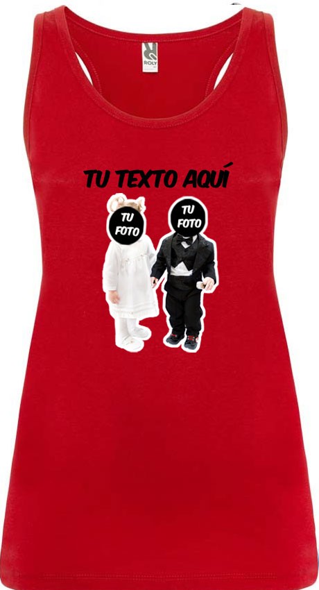 Camiseta de tirantes para mujer con prediseño de imagen de bebés vestidos de boda sobre la que podrá poner las caras de los novios y una frase divertida.