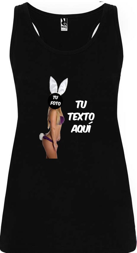 Personalice su camiseta de despedida de tirantes con este modelo que lleva una divertida foto de conejita en la que podrá incluir la cara de la novia. Tiene espalda tipo nadadora y se ajusta a la cintura.
