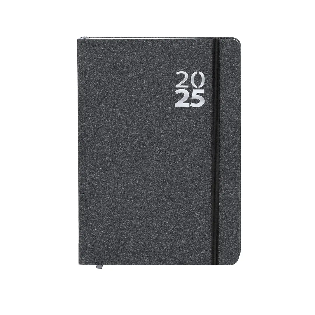 Agenda de tamaño A5 en Cartón Reciclado. Con cubiertas rígidas y elástico de cierre a juego. Incluye caja kraft de presentación. Con distintitivo ECO.Diseño página día, zona de anotaciones y marcapáginas de tela. En 2 idiomas: castellano e inglés. El Cartón Reciclado proviene del reaprovechamiento de excedente de fabricaciones y reciclaje de papel en el final de su vida útil, convirtiéndose en un lienzo ecológico y sostenible.