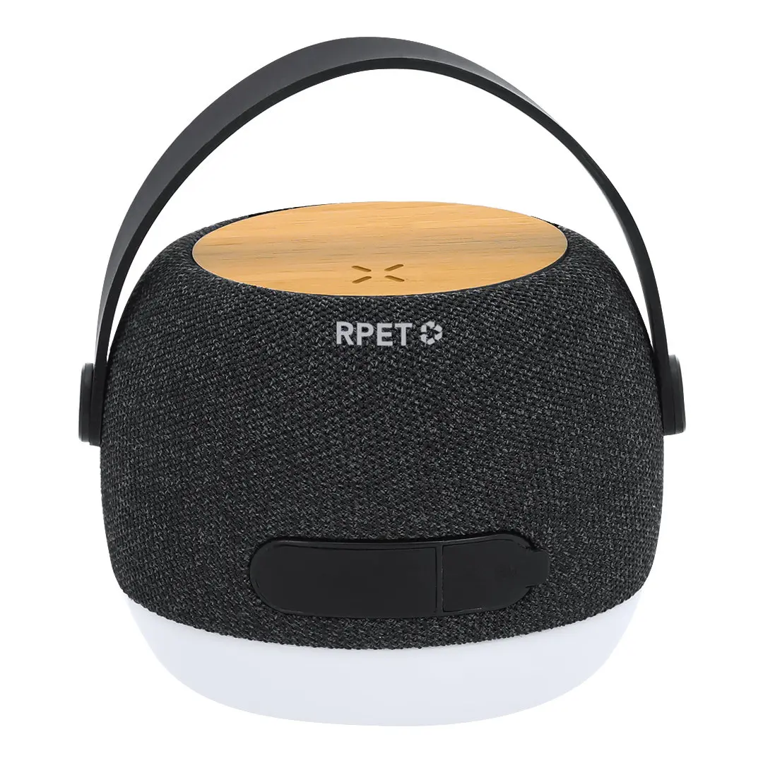 Altavoz cargador Bluetooth con carga inalámbrica de 15W, fabricado en RPET y bambú. Equipado con un sistema de iluminación, con 12 LEDs, que se sincronizan con el ritmo de la música, creando ambientes vibrantes y envolventes. Incluye una práctica y suave asa de silicona para facilitar su transporte. Incluye distintivo RPET.El material RPET se elabora a partir de plástico reciclado, para así fomentar la reutilización de residuos plásticos y ayudar a la sostenibilidad del planeta.Materiales como el Bambú fomentan la utilización de materias primas naturales, reduciendo las emisiones contaminantes. Proviene de una planta de gran resistencia y versatilidad, con crecimiento y regeneración rápidos, siendo una excelente alternativa al uso de madera tradicional.