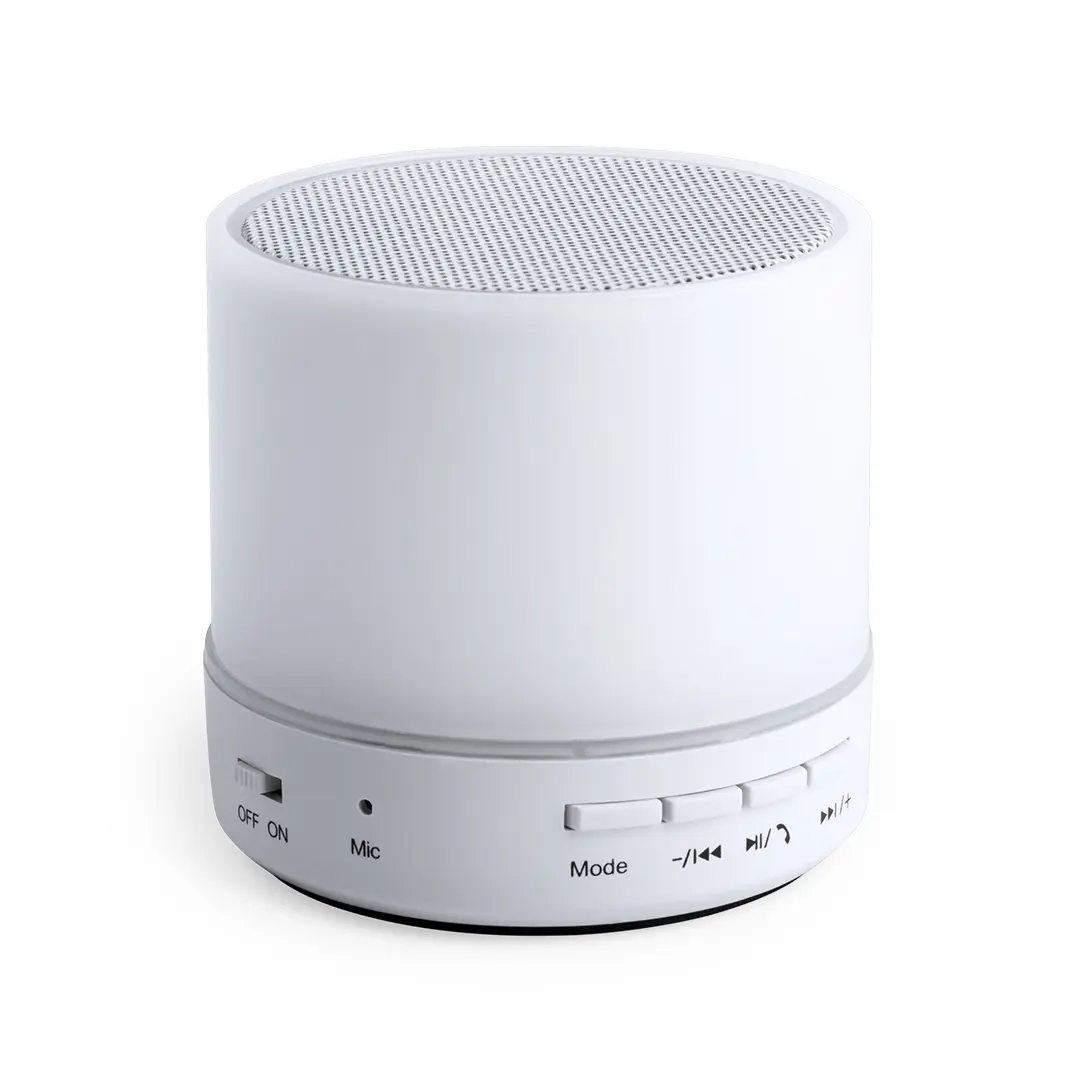 Altavoz de Tecnología Led Inteligente y conexión Bluetooth®. 3W de potencia, con ranura USB para reproducir música desde unidad externa y función manos libres. Ranura para tarjetas micro SD de hasta 32 GB de capacidad, entrada auxiliar de línea mediante conexión jack de 3,5mm y base antideslizante. Radio FM, con luz multicolor, recargable mediante cable USB -incluido- y presentado en una atractiva caja de diseño.
