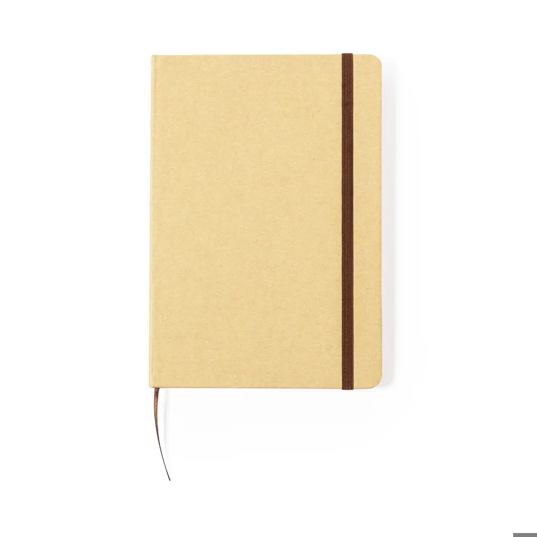 Bloc de notas A5 de línea nature, con tapas duras en resistente cartón reciclado. De 100 hojas lisas en acabado kraft con distintivo reciclado, con elástico de sujeción y marcapáginas de tela a juego.
