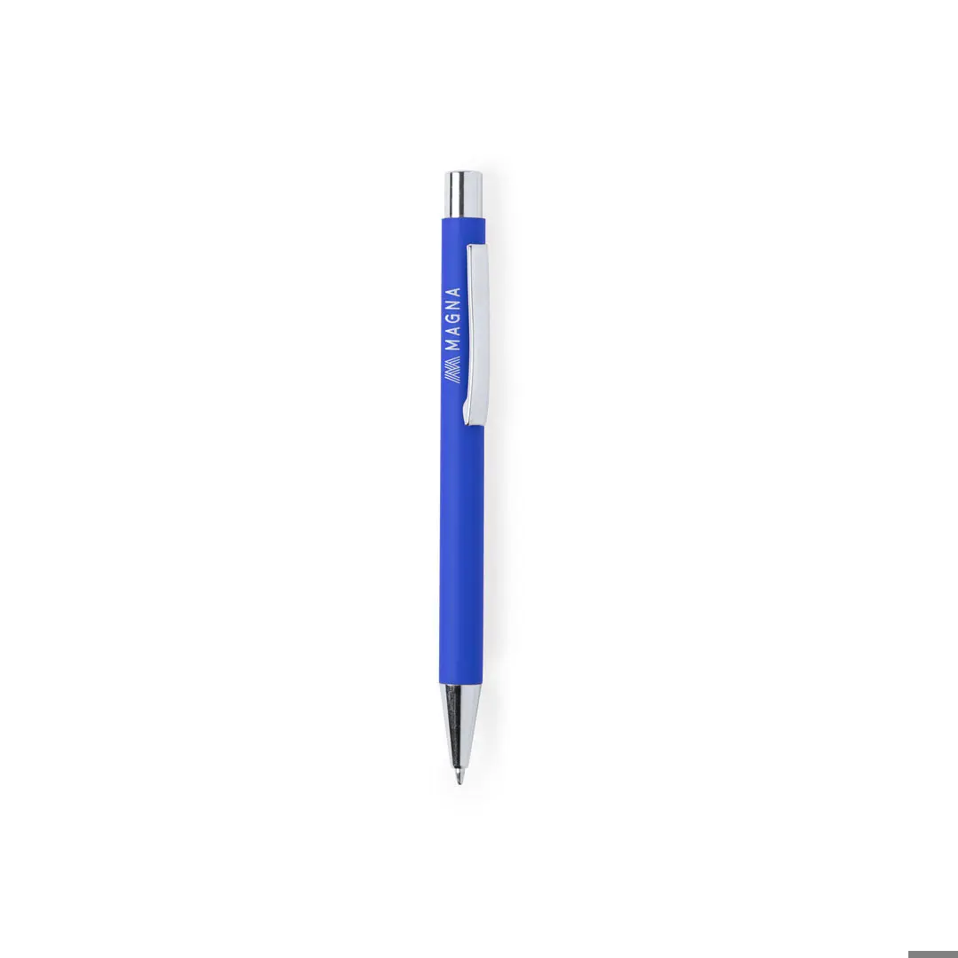 Original bolígrafo de mecanismo pulsador en elegante diseño bicolor. Con cuerpo de aluminio en tacto goma de acabado mate. Especialmente diseñado para marcaje en láser y mostrar el logotipo en tono plateado. Clip, parte superior y punta en plateado. Disponible en variada gama de colores, con cartucho jumbo y tinta azul.