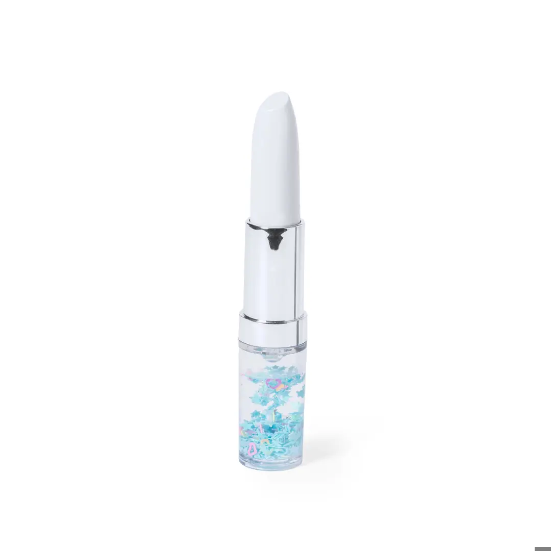 Original bolígrafo en forma de pintalabios, con líquido interior en colorido diseño. Con capucha y en tinta azul.