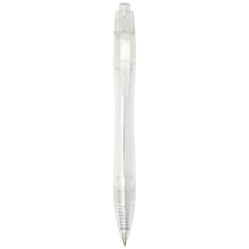 Bolígrafo con mecanismo de presión y cuerpo transparente. El cuerpo está fabricado con botellas de agua recicladas, lo que contribuye a reducir la cantidad de residuos plásticos.