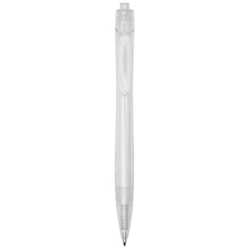 Bolígrafo retráctil fabricado con plástico PET reciclado, lo que contribuye a reducir la cantidad de plástico virgen. El bolígrafo tiene un cuerpo transparente y un pulsador de color. Está precargado con un recambio azul y puede combinarse con la libreta de RPET 107763 Honua.