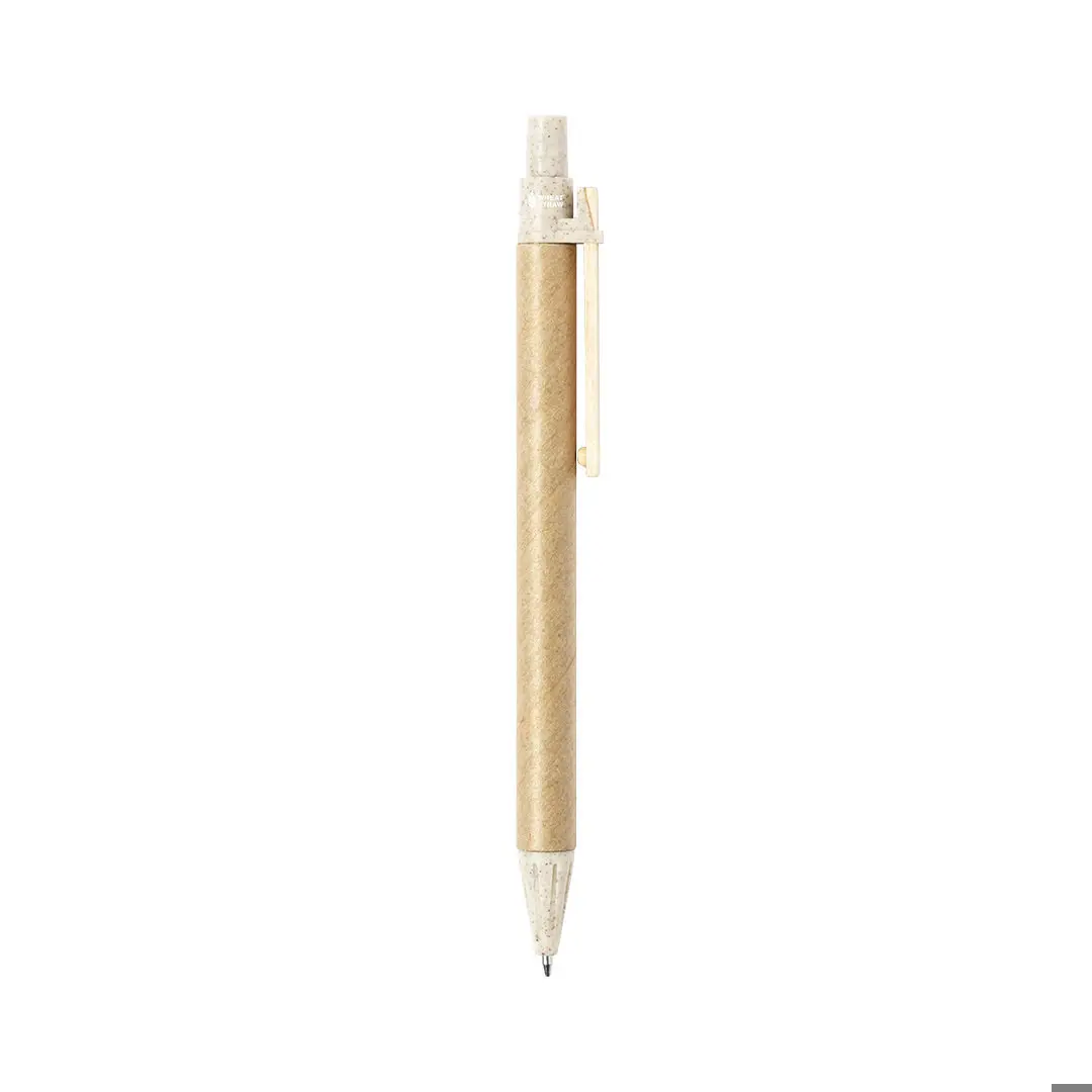 Bolígrafo de línea nature con mecanismo pulsador. Combinación de cuerpo en cartón reciclado de color natural, con punta y pulsador en caña de trigo y clip de madera, para así fomentar la utilización y reciclado de materias primas, reduciendo así las emisiones contaminantes. Tinta azul. Con distintivo Wheat Straw en la parte superior.