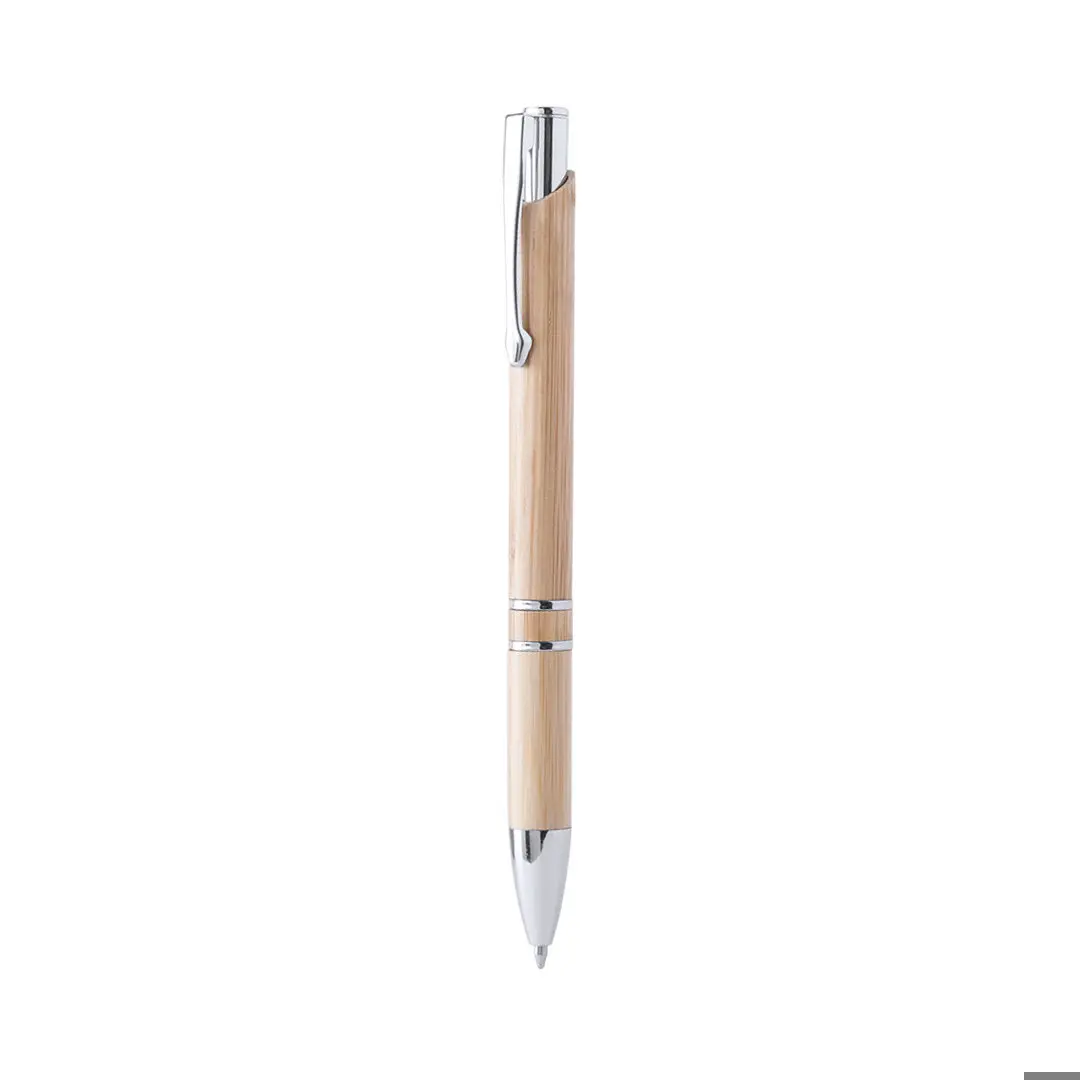 Bolígrafo de línea nature con cuerpo en madera de bambú. De mecanismo pulsador, con clip troquelado y detalles en acabado cromado. De cartucho jumbo y tinta negra.
