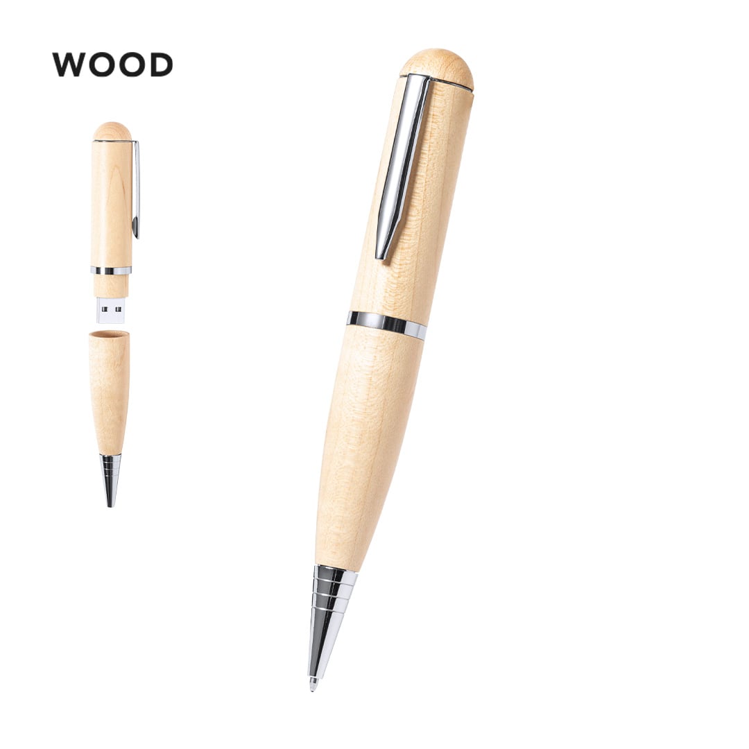 Bolígrafo USB de línea nature. Con memoria USB de 16GB de capacidad integrada en la capucha y fabricado en madera, para así fomentar la utilización de materiales naturales. De mecanismo giratorio y con tinta azul. Presentado en atractiva caja de acabado kraft.