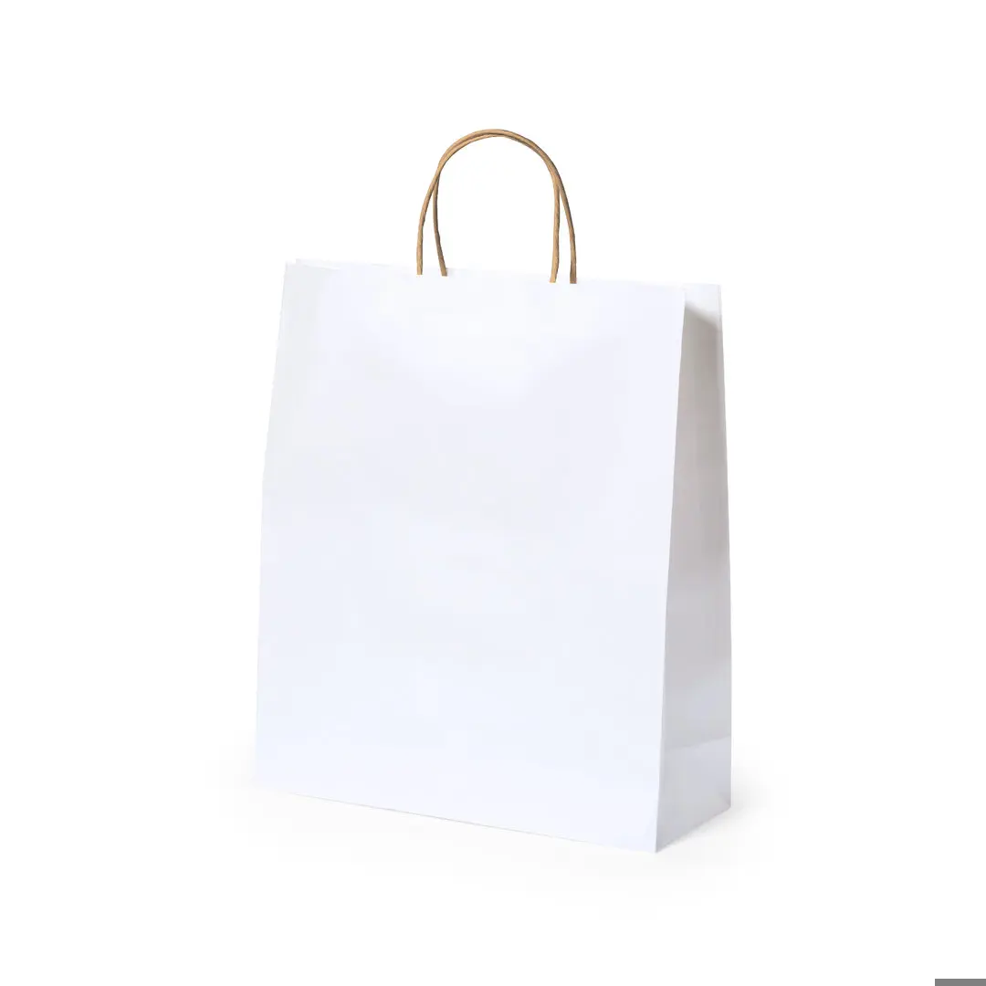 Bolsa de línea nature, fabricada en papel reciclado acabado en blanco de 100g/m2, con asas cortas reforzadas en tono natural y fuelle. Resistencia hasta 8 kg de peso.