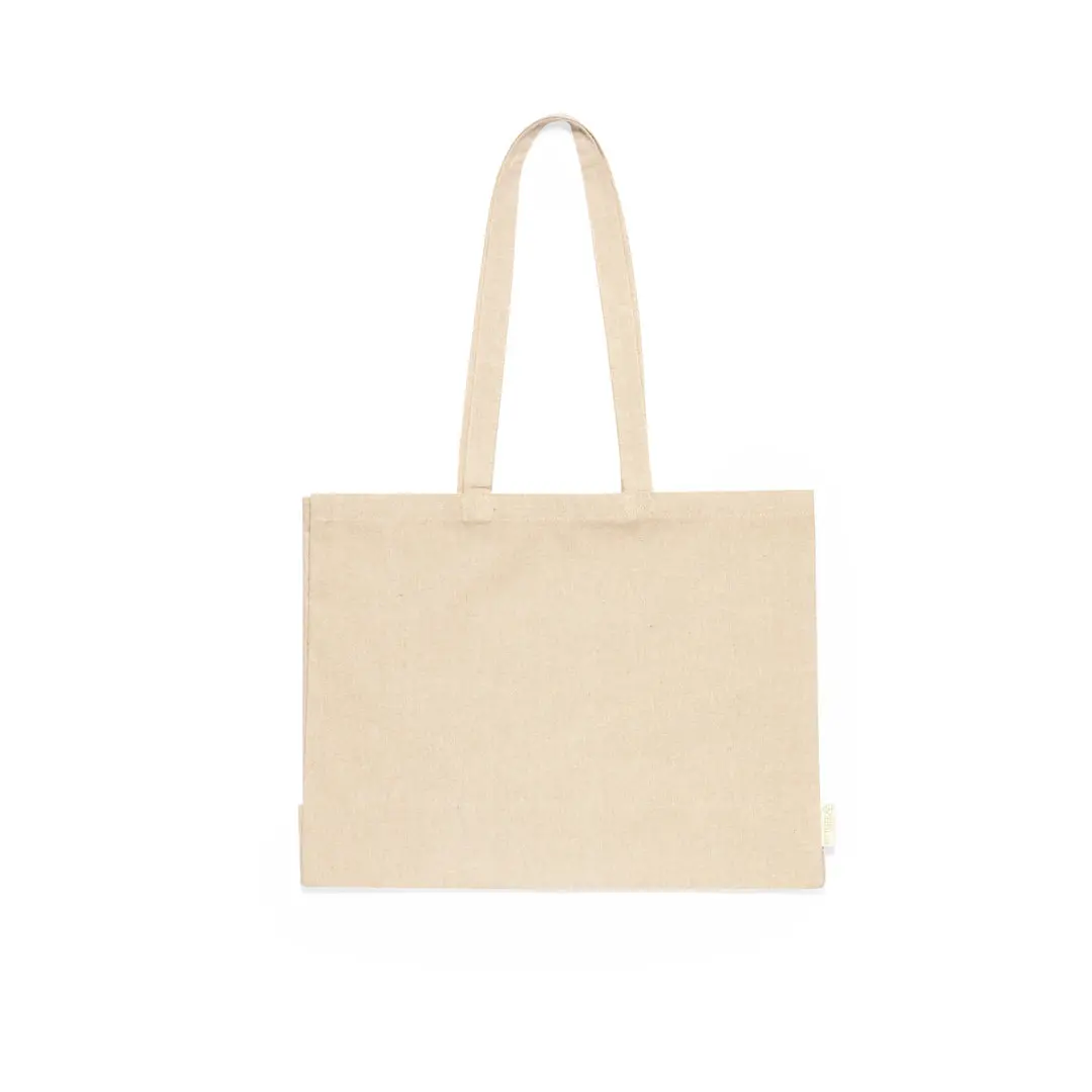 Bolsa de línea nature, fabricada en algodón reciclado de alto gramaje (240g/m2). De acabado cosido y con asas largas reforzadas (70 x 2,5 cm). Con fuelle y disponible en colores natural y negro, con distintivo algodón reciclado en etiqueta exterior. Resistencia hasta 10 kg de peso. Certificación GRS (Global Recycled Standard / Estándar de Reciclaje Global), que garantiza el origen reciclado del material usado para fabricar el producto