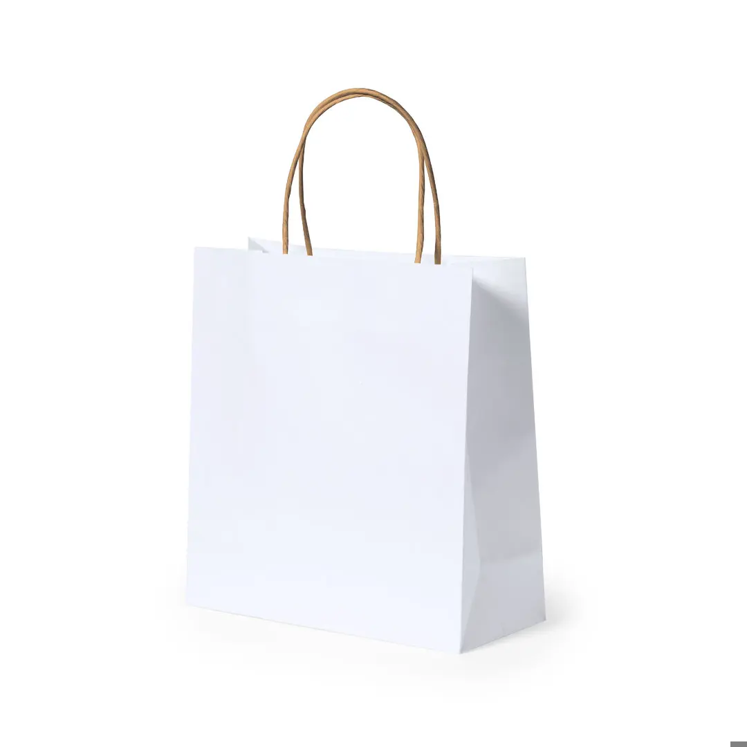 Bolsa de línea nature, fabricada en papel reciclado acabado en blanco de 100g/m2, con asas cortas reforzadas en tono natural y fuelle. Resistencia hasta 6 kg de peso.