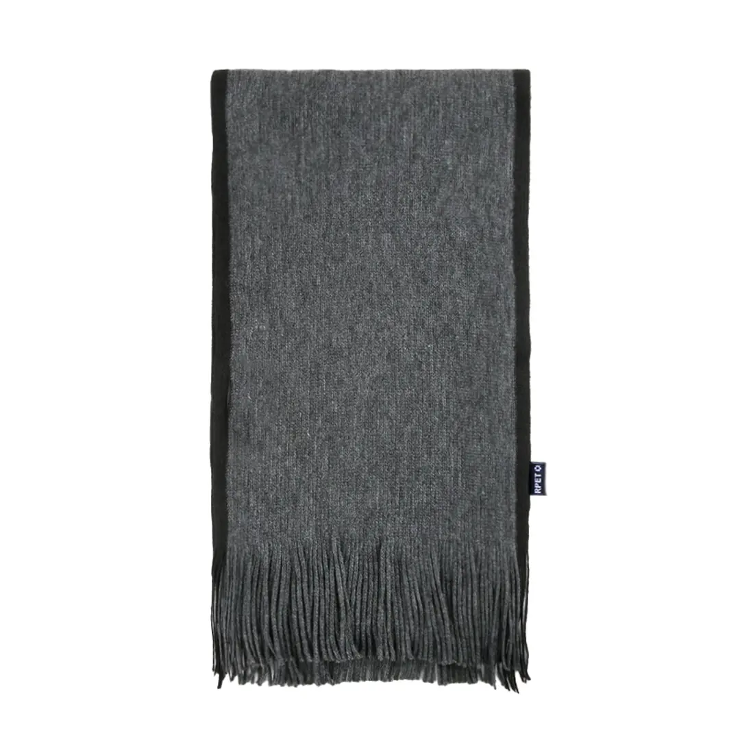 Suave y cálida bufanda confeccionada en cálido poliéster RPET. Fabricada en elegantes colores bitono con bordes en distinto color, terminación en flecos. Con logotipo RPET en etiqueta. Presentada individualmente en caja negra. .El material RPET se elabora a partir de plástico reciclado, para así fomentar la reutilización de residuos plásticos y ayudar a la sostenibilidad del planeta.