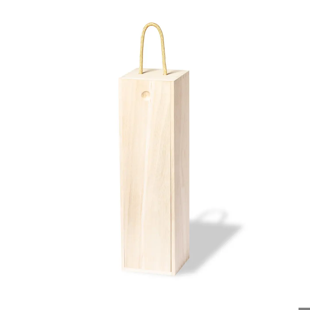Caja de presentación premium para 1 botella, fabricada en madera natural de Paulownia, ligera y resistente. Interior con sujeción de seguridad para el cuello de la botella, con tapa deslizante y cordón de transporte.