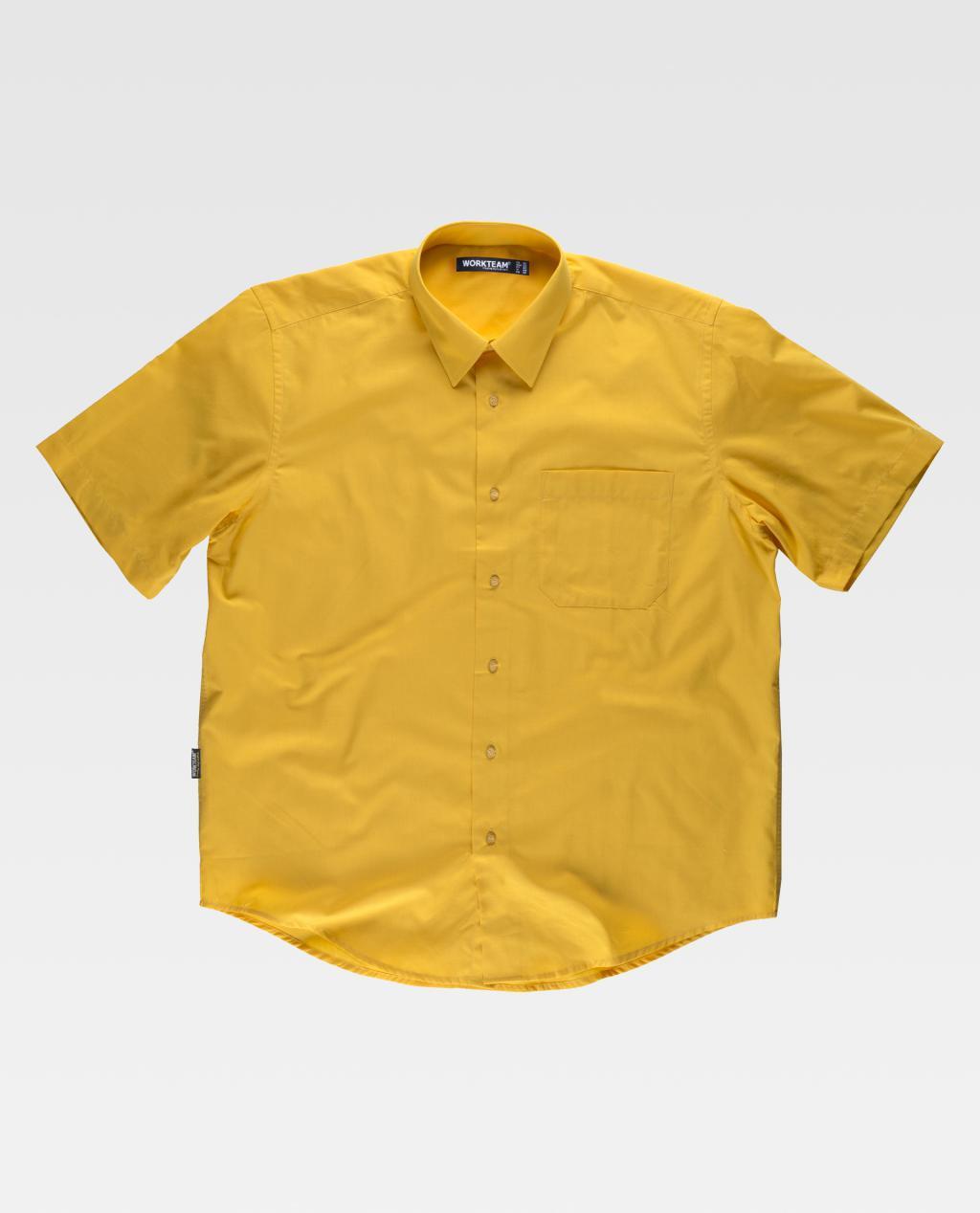 Camisa de manga corta con cuello clásico y cierre central de botones. Un bolso de pecho de plastón abierto. Espalda con canesú. Costuras reforzadas, bajo redondeado y botones al tono