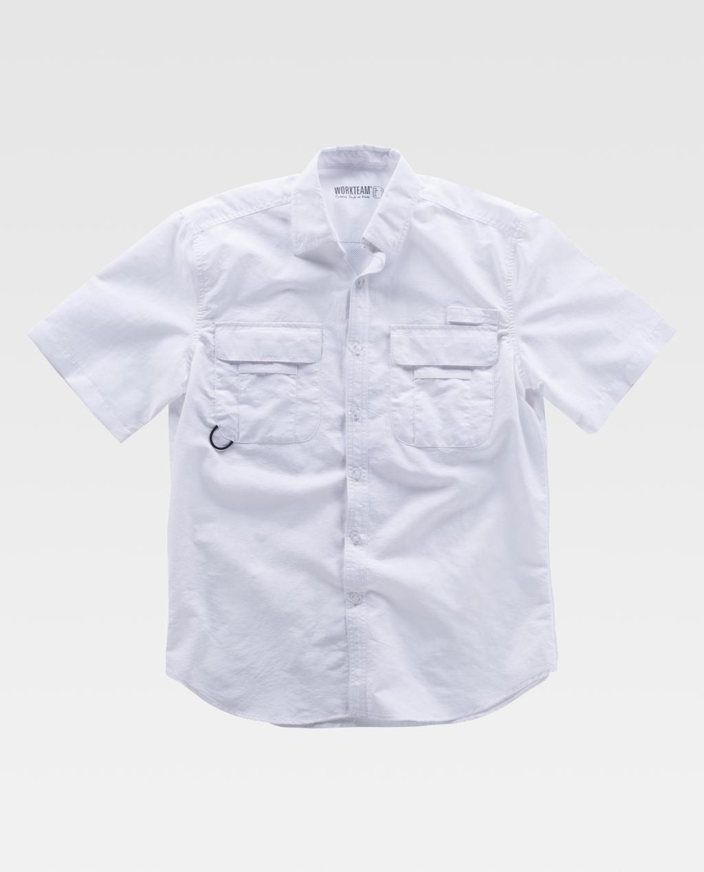 Camisa safari de manga corta con abertura trasera y rejilla interior para regular la transpiración. Cuello abotonado y cierre central de botones. Dos bolsos de pecho de plastón con cartera de velcro y bolsillos auxiliares superpuestos. Argolla de cordón elástico en bolso. Trabilla con velcro en el pecho. Espalda con canesú. Costuras reforzadas, bajo redondeado y botones al tono. Tejido resistente y de secado rápido.