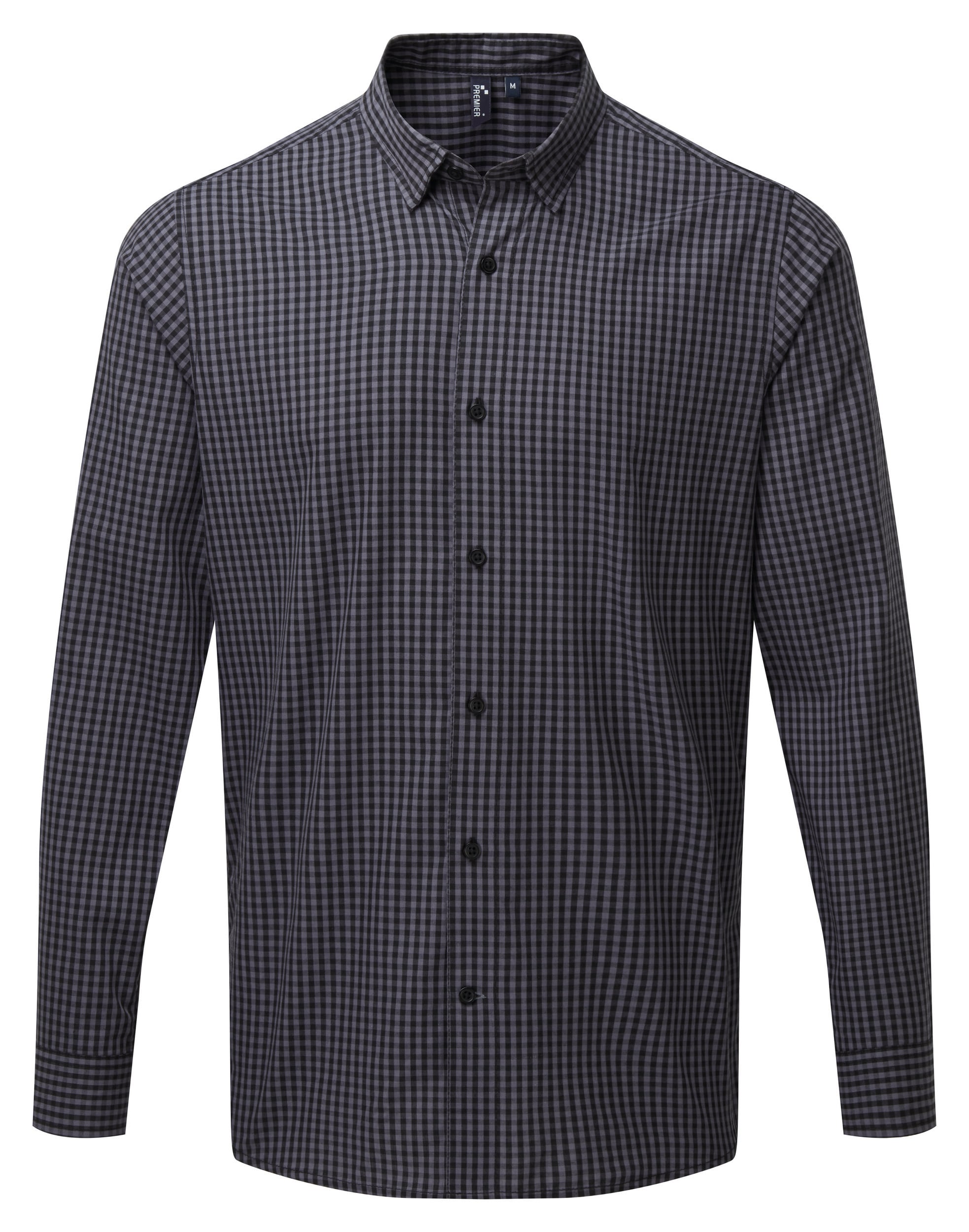 65% poliéster/35% algodón popelina hilo tintado. Camisa de manga larga con botones en los puños. Botón en el cuello. Lavado doméstico a 60°C.