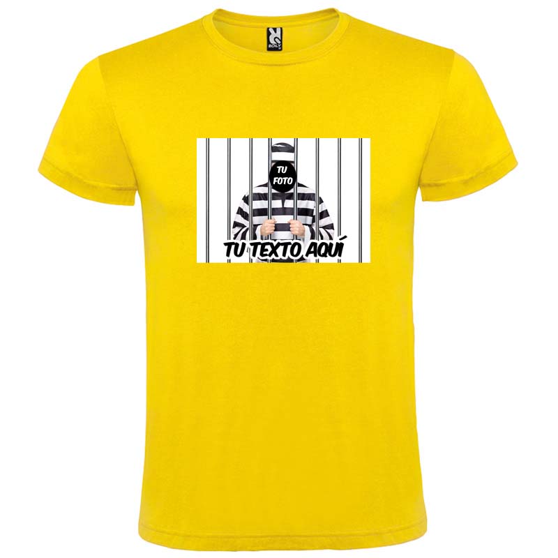 Personaliza tus camisetas para despedida con este diseño de presidiario. Solo tienes que mandarnos la foto del novio o de la persona que quieras, y nosotros la montaremos en la cara del presidiario. Además, incluiremos el texto personalizado que nos digas, siempre teniendo en cuenta que sea legible. Hay hasta 12 colores diferentes para elegir, en 100% algodón, con punto liso, por lo que la estampación del montaje quedará perfecta, pudiendo utilizarse para esa ocasión tan especial. Las tallas disponibles son de la S a la 3XL, y su tejido no posee costuras laterales. Este modelo de camiseta de despedida es para hombre, pero puede consultar también en nuestra web el diseño para mujer con camiseta ajustada.