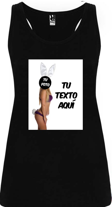 Camiseta para despedida de soltera en tirantes con diseño de conejita sobre fondo blanco. Puede incluir su cara y crear así una divertida prenda para celebrar su despedida de soltera. Esta camiseta tiene un corte entallado que se ajusta a la figura, además de espalda de tipo nadadora.