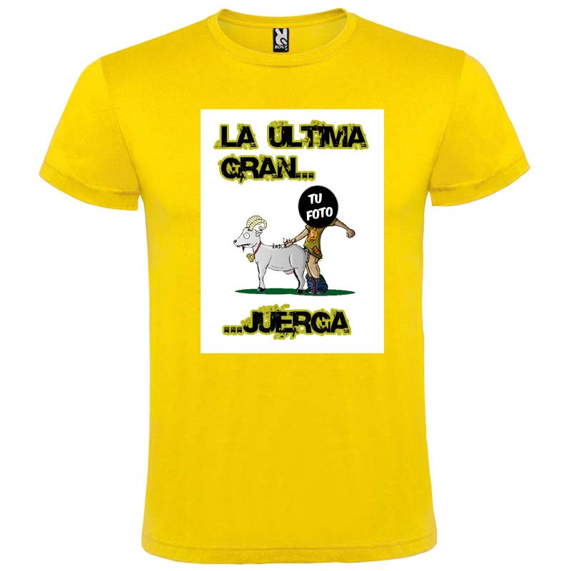 Para los más atrevidos, que quieran celebrar una despedida de soltero de lo más cabra, tenemos este diseño especial para camisetas de despedida, en el que aparece el lema de La última Gran Juerga además de un dibujo en el que se puede incluir el rostro del novio o de quien se desee. Los colores en los que puede elegirla son hasta 12 distintos: desde el clásico blanco, hasta la camiseta más atrevida en color fucsia o amarillo. Las tallas son unisex y van desde la S a la 3XL. Es muy cómoda, ya que no tiene costuras en los laterales, y está rematada con doble costura en el cuello, así como cubrecosturas en la zona de los hombros. La composición es total de algodón, y está indicada para estampación mediante transfer de impresión digital, para poder plasmar a la perfección todos los colores que lleva el diseño.
