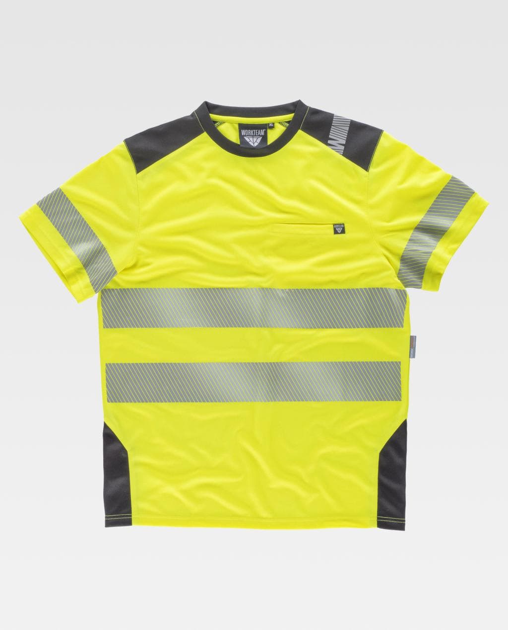 Camiseta de alta visibilidad combinada. Manga corta en poliéster micropiqué con cintas reflectantes segmentadas. Cuello redondo con cubrecosturas interior y franjas a contraste en hombros y costados. Un bolso de pecho de ojal. Una cinta reflectante segmentada termoadhesiva en mangas y dos de distinto tamaño en pecho y espalda. Cinta decorativa personalizada en un hombro. Tejido fresco y ligero de alta permeabilidad al aire. Transpirable, de fácil secado y resistente al encogimiento.