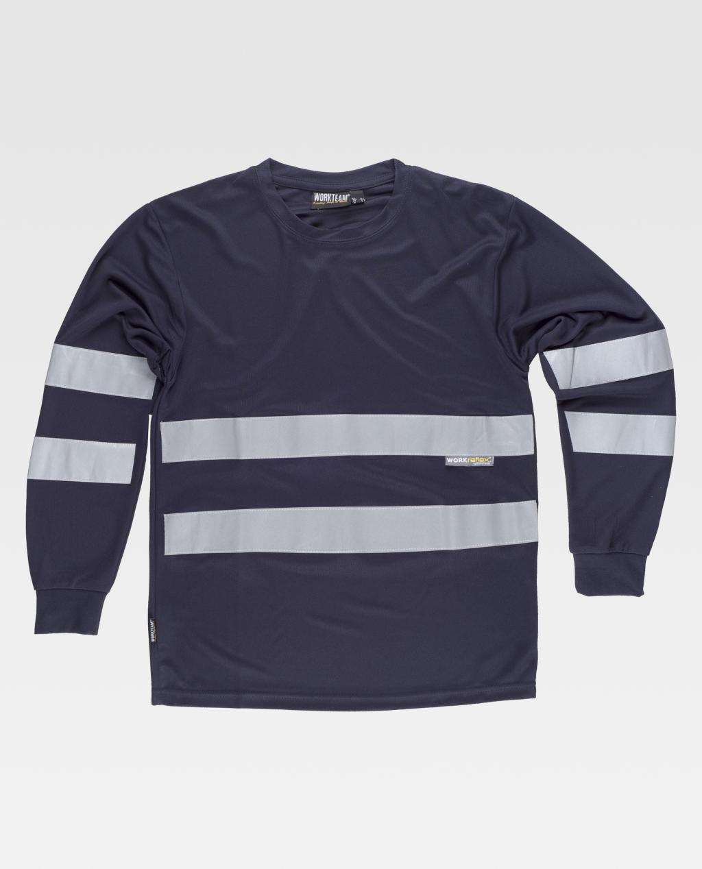 Camiseta de manga larga en poliéster ojo de perdiz con cintas reflectantes. Cuello redondo con cubrecosturas interior. Dos cintas reflectantes en pecho, espalda y mangas. Puño elástico. Tejido fresco y ligero de alta permeabilidad al aire. Transpirable, de fácil secado y resistente al encogimiento.
