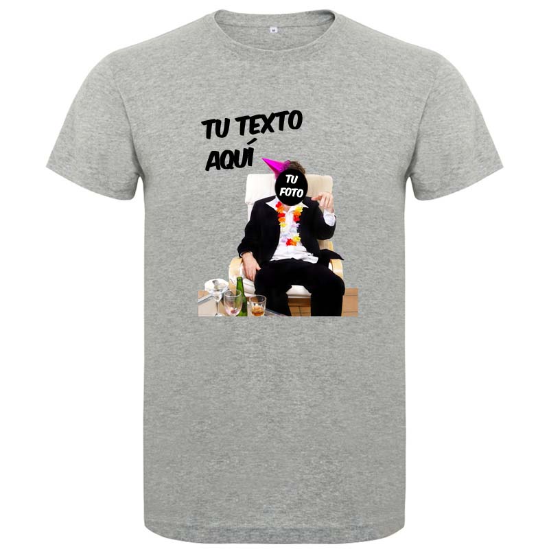 Para celebrar su despedida de soltero con un toque de humor recomendamos este diseño de camiseta para fiestas, en el que aparece un borracho con traje que está pasando la mayor fiesta de su vida. Como puede ver en la imagen de ejemplo, hay espacio para incluir una fotografía del rostro de quien desee, además de dejar espacio para un breve texto que complete la composición. El texto y la foto del rostro los dejamos a su elección. Imagine a su mejor amigo reflejado en esta camiseta, con un mensaje que diga: Nosotros nos encargamos de realizar el montaje y estamparlo sobre las camisetas. En esta versión, el fondo de la composición se corresponderá con el de la camiseta, ya que el diseño irá troquelado. Puede también solicitarnos la versión con el fondo en blanco, que se estampará mediante transfer, como una fotografía al uso. Esta camiseta unisex especial para fiestas está disponible en hasta 12 colores y en las tallas de la S a la 3XL.