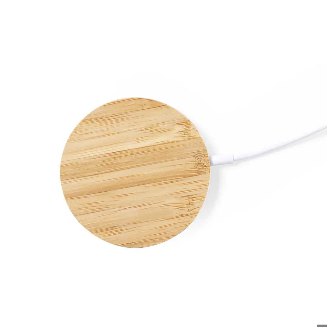 Cargador inalámbrico magnético de línea nature con función soporte para móvil. Cargador inalámbrico fabricado en bambú, y carcasa en PLA -Ácido PoliLáctico-, que se obtiene a partir de recursos 100% naturales como el almidón de maíz, la yuca o la caña de azúcar, pudiendo convertirse en 100% compostable al final de su ciclo de vida útil. Con función carga rápida de 10W y compatible con dispositivos equipados con tecnología de carga inalámbrica. Incluye anilla metálica adhesiva. Cable con conexión USB de 100 cm. Amplia superficie de marcaje, presentado en atractiva caja de diseño eco.Distintivo PLA sobre el artículo.