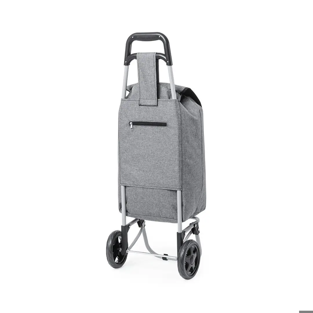 Carro de compra plegable y línea nature. Fabricado en resistente poliéster 600D RPET, elaborado a partir de plástico reciclado, para así fomentar la reutilización de residuos plásticos y ayudar a la sostenibilidad del planeta. Con asa reforzada, cuerpo metálico tubular, bolsillo de cremallera posterior y soportes con gomas de protección. Ruedas reforzadas de alta calidad. Etiqueta distintiva RPET en la solapa.