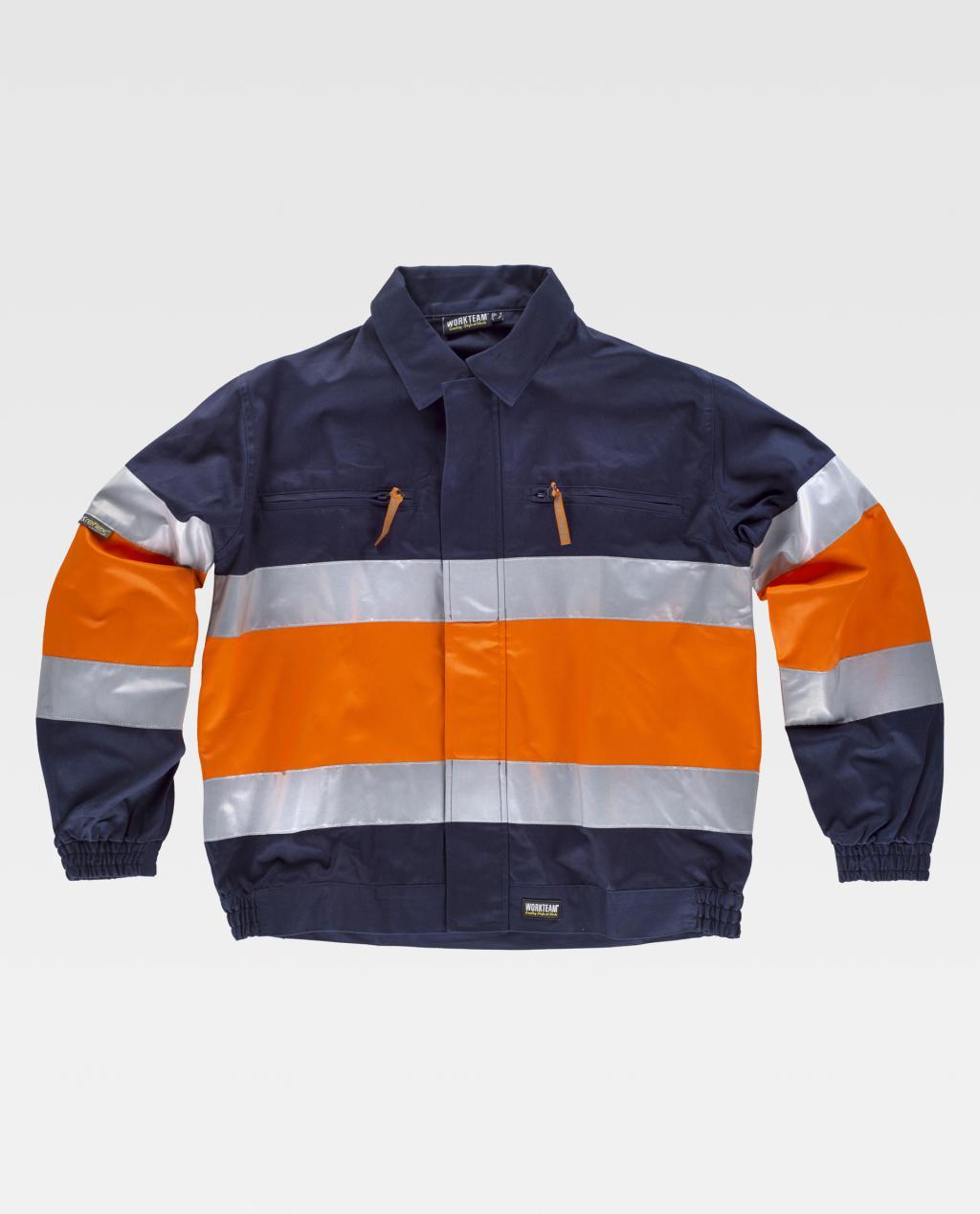 Cazadora de algodón combinada con alta visibilidad y cintas reflectantes. Cuello camisero y cierre de cremallera de nylon oculta por solapa postiza con velcro. Dos bolsos de pecho interiores con cierre de cremallera de nylon. Dos cintas reflectantes en pecho, espalda y mangas con pieza central de alta visibilidad. Puño con elástico. Cierre de velcro en cintura y elástico en los laterales.