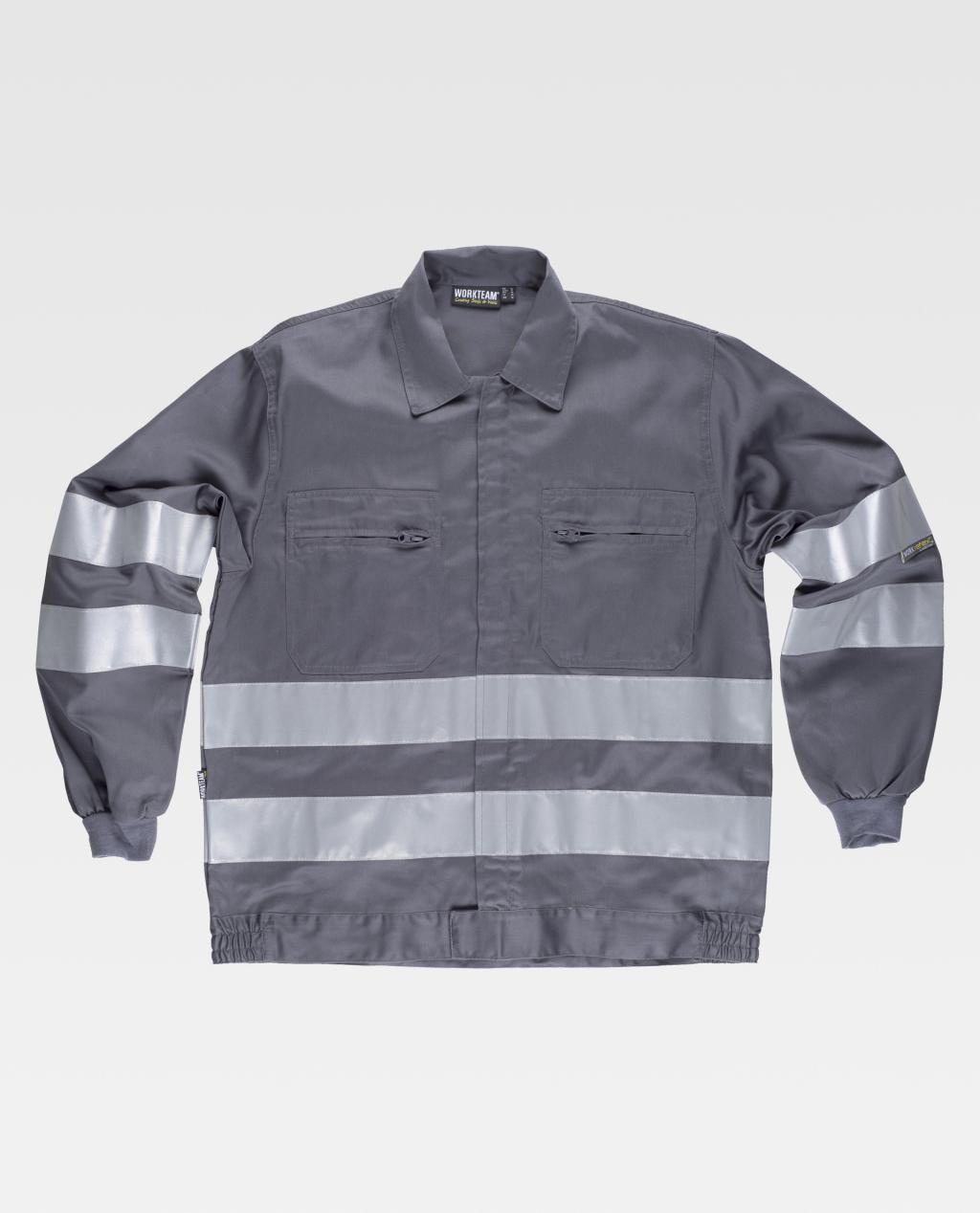 Cazadora con cintas reflectantes. Cuello camisero y cierre de cremallera de nylon oculta. Dos bolsos de pecho de plastón con cierre de cremallera de nylon. Dos cintas reflectantes en pecho, espalda y mangas. Puño elástico. Cierre de velcro en cintura y elástico en los laterales.