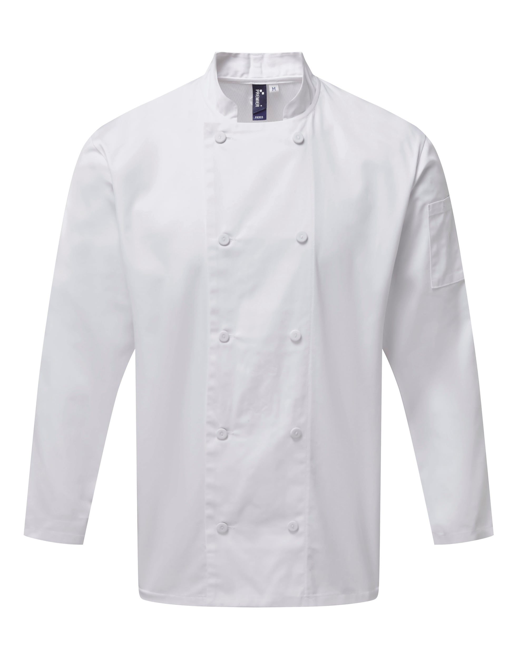 65% poliéster /35% algodón de sarga. Panel central en la espalda de tejido Coolchecker® que permite el control de la humedad y la eliminación de la transpiración. Cierre frontal de diez botones de tela. Cuello mandarín con cremallera en la nuca. Doble bolsillo para bolígrafo en el brazo izquierdo. Lavado doméstico a 60°C.