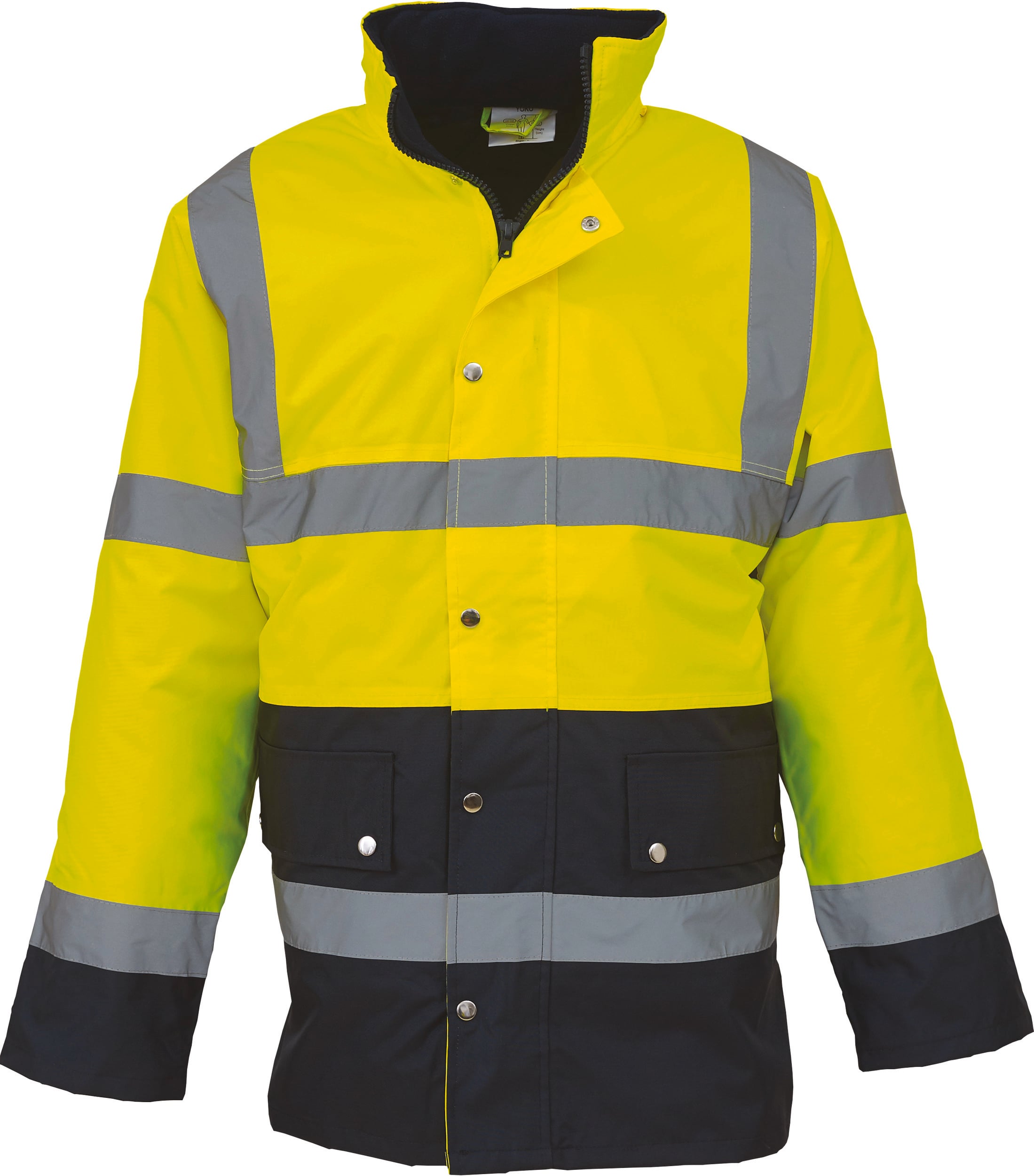 100% poliéster 300D con revestimiento de PU impermeable, relleno acolchado de 190 g/m² y forro de nylon. Dos tiras reflectantes 3M de 5 cm alrededor del cuerpo, de los brazos y una en cada hombro. Cremallera ultrarresistente en la parte delantera con solapa antitempestad con botones a presión. Dos bolsillos exteriores con solapa antitempestad. Puños antitempestad de punto. Capucha integrada en el cuello con cordones. Bolsillo interior en el pecho. Costuras cosidas y selladas para la impermeabilidad. Cumple con las normas EN ISO 20471:2013 Categoría 3 y EN343 Cat. 3 Niv. 1 sobre protección contra el mal tiempo. Hi-Vis Orange/Navy también cumple con la norma relativa a las «Prendas de Alta Visibilidad» de las vías férreas UK GO/RT 3279 emitida 8:2013. 25 lavados max. Lavable a máquina a 40 ° C. No lavar en seco.