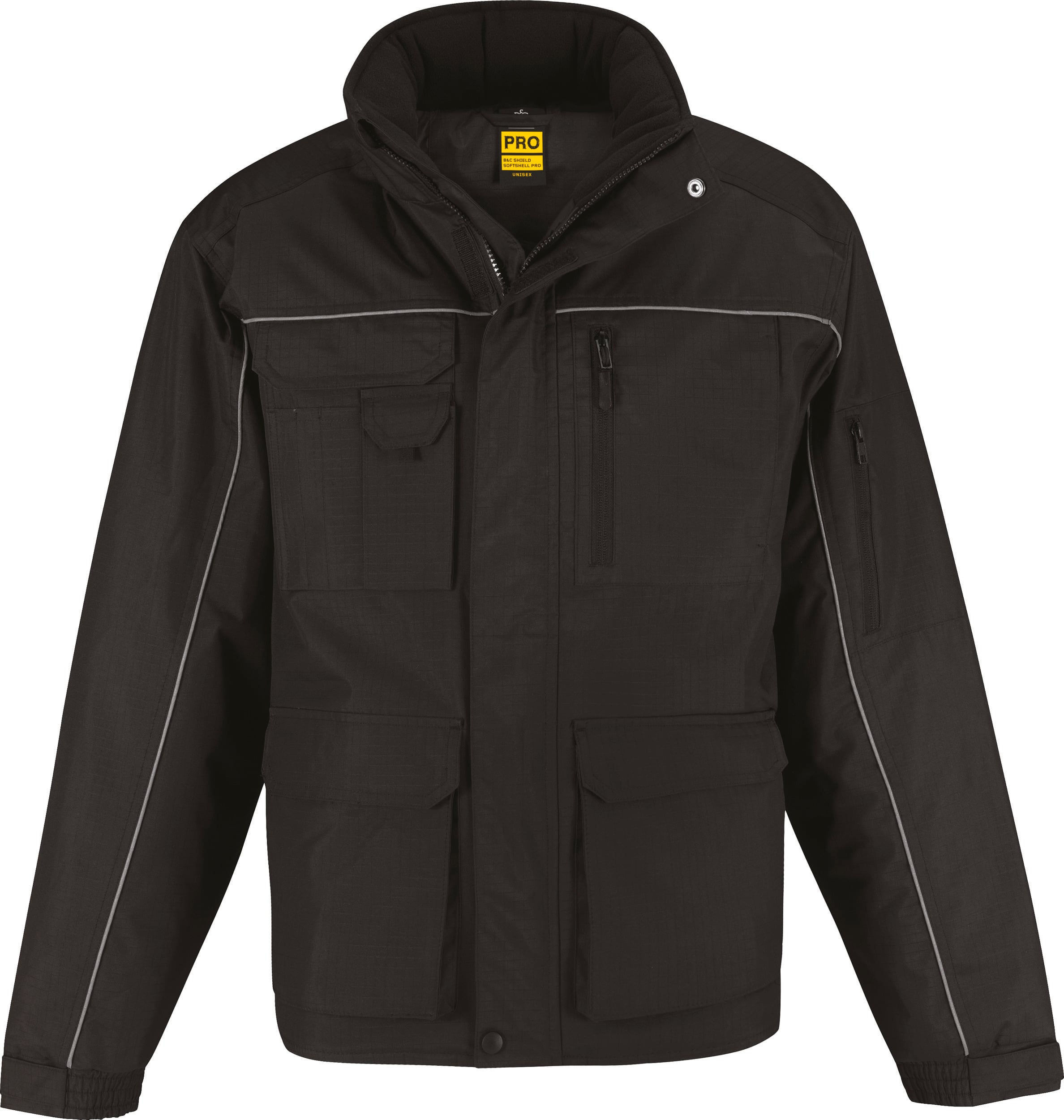 Capa exterior: 100 % poliéster pongé Ripstop impermeable (5000 mm) y cortavientos. Capa interior: forro 100 % poliéster forrado 200 g/m2. Espalda más larga. Cuello alto con forro de micropolar, protector de mentón y solapa exterior contra el mal tiempo. Ribete reflectante en la parte delantera y trasera. Capucha ergonómica forrada e integrada en el cuello con cordón elástico y 2 bloqueadores. Puños ajustables. Costuras con doble pespunte en los hombros, las sisas y los bolsillos de la cintura con refuerzo. 12 bolsillos multifunción (varios bolsillos anchos con solapa de protección, bolsillo en el pecho exterior con cremallera, bolsillo exterior para el smartphone, 3 bolsillos exteriores para bolígrafos y 2 bolsillos con doble entrada en la parte delantera con acceso lateral a los bolsillos de polar para calentar las manos y con solapa, 1 bolsillo parche para la cartera en el interior y solapa y 1 bolsillo con cremallera en la manga). Acceso fácil para la decoración.