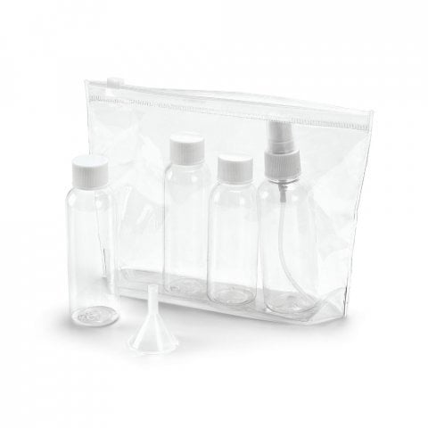 Neceser hermético de PVC. Incluye 3 envases (2 x 65 ml y 60 ml), 1 vaporizador (80 ml) y 1 embudo. Adecuado para llevar cosméticos en la cabina del avión.190 x 155 x 40 mm