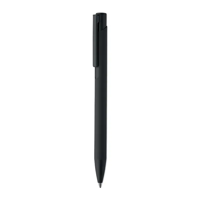 Bolígrafo de aluminio reciclado con clip de hierro y cuerpo engomado en color. Tinta azul.