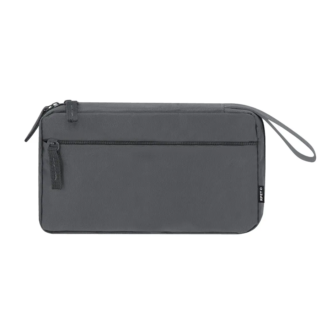 Estuche organizador fabricado en RPET 900D. Incluye bolsillo principal de apertura completa con doble tirador metálico y múltiples bolsillos interiores ideales para guardar cables: 3 bolsillos con banda elástica y 1 con cierre de cremallera. Además, incorpora un bolsillo exterior con cierre de cremallera invisible y asa para un cómodo transporte. Con distintivo RPET.El material RPET se elabora a partir de plástico reciclado, para así fomentar la reutilización de residuos plásticos y ayudar a la sostenibilidad del planeta.