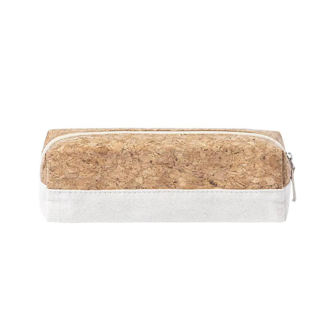 Estuche de línea nature en combinación de corcho natural y algodón crudo. Con cierre de cremallera y tirador en algodón a juego. Presentación individual en bolsa de material reciclado.