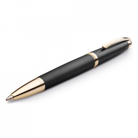 Bolígrafo metálico con mecanismo de giro con clip y detalles dorados. Se entrega en estuche de papel kraft. Escritura azul.ø11 x 139 mm | Caja: 180 x 43 x 22 mm