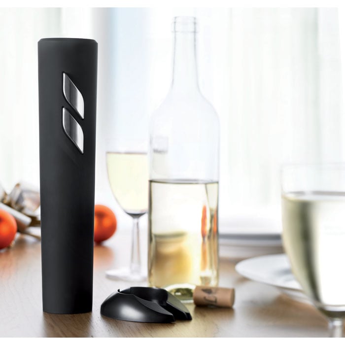 Abridor de botellas eléctrico. Carcasa realizada en ABS con acabado negro mate. Incluye corta cápsulas. Funciona con 4 pilas AA no incluidas.