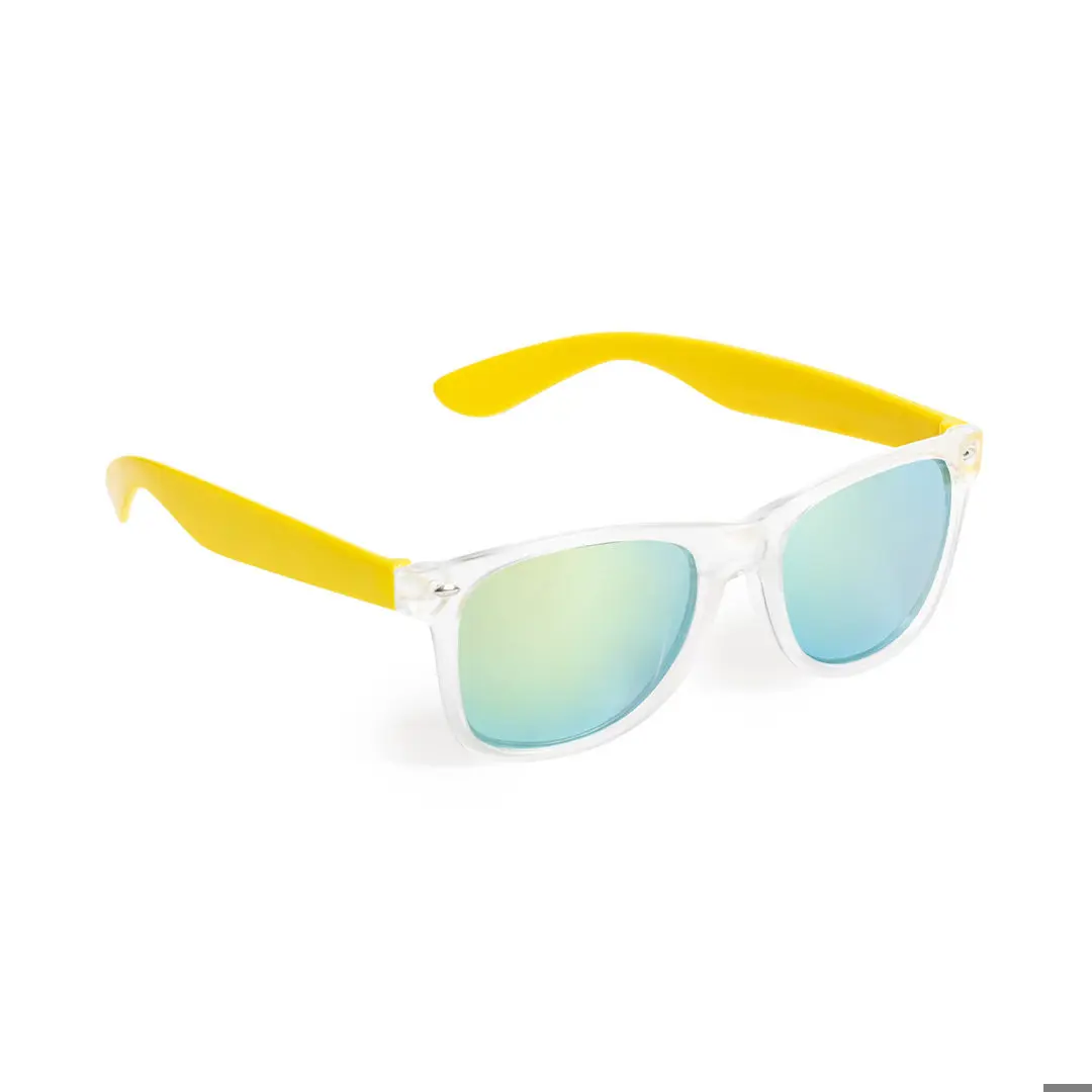 Gafas de sol con protección UV400 de clásico diseño. Con montura de acabado translúcido, patillas en divertidos colores y lentes espejados a juego.