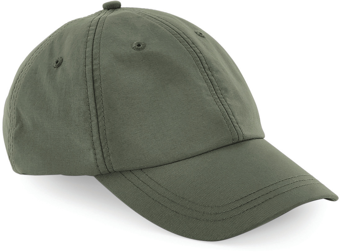 100% Nylon Ripstop. Etiqueta TearAway (removible) para facilitar el cambio de marca. 6 paneles y visera precurvada. Impermeable y transpirable. Tira de sudoración 100% poliéster Coolmax® . Correa ajustable con cierre de clip. A la vez impermeable y transpirable. Tira de sudoración Coolmax®. Etiqueta extraíble, fácil de volver a etiquetar.
