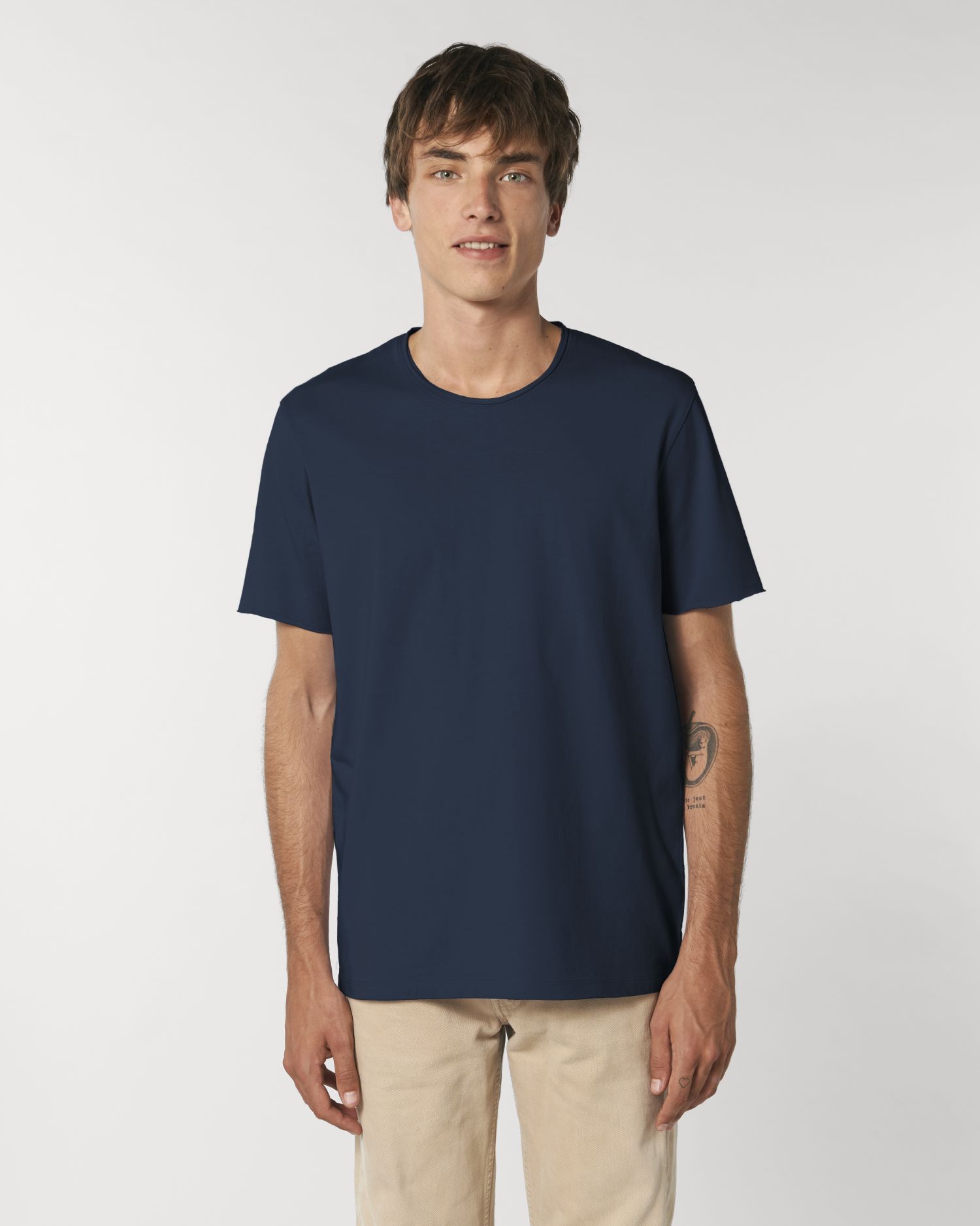 La camiseta unisex raw edge. Corte normal, Cuello redondo, Short Sleeve, Punto de jersey sencillo. Manga pegada Puntada simple en cuello raw edge Puntada de cadeneta en mangas raw edge Puntada doble estrecha en bajo Prenda lavada