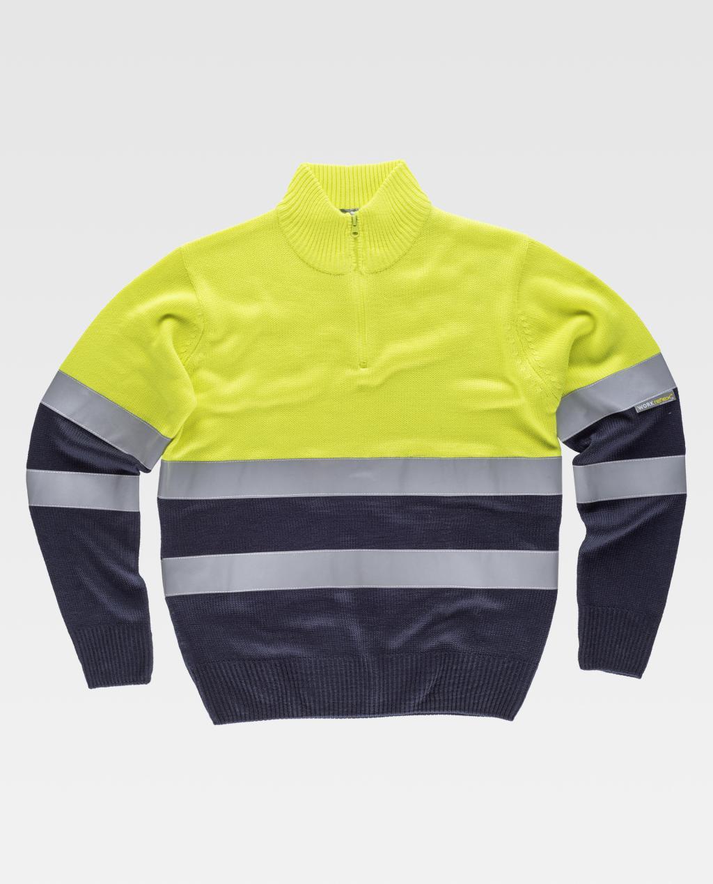 Jersey combinado de punto grueso con cintas reflectantes. Parte superior de alta visibilidad. Cuello alto con cierre de media cremallera de nylon. Cuello, puños y cintura en punto canalé. Dos cintas reflectantes en pecho, espalda y mangas. Jersey combinado de punto grueso con cintas reflectantes. Parte superior de alta visibilidad. Cuello alto con cierre de media cremallera de nylon. Cuello, puños y cintura en punto canalé. Dos cintas reflectantes en pecho, espalda y mangas.