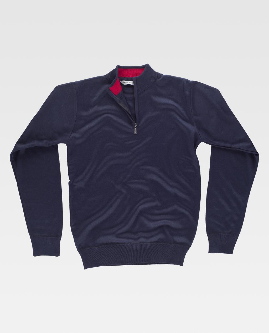 Jersey de cuello alto con vista combinada en punto fino. Cierre de media cremallera de nylon. Cuello, puños y cintura elásticos en punto canalé.